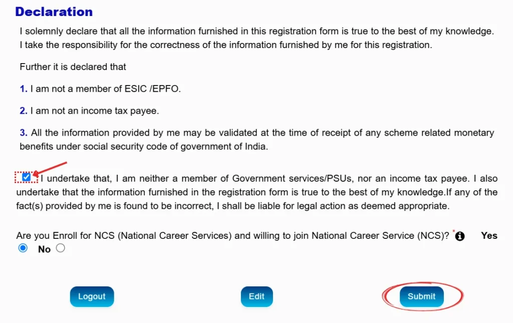 - सभी जानकारी भरने के बाद Self Declaration को ध्यान से पढ़े और नीचे Consent पर टिक करके Submit पर क्लिक कर दे।