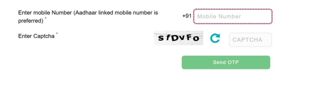 - अब अपने आधार से जुड़ा मोबाइल नंबर और कैप्चा दर्ज करे। इसके बाद Send OTP बटन पर क्लिक करे।