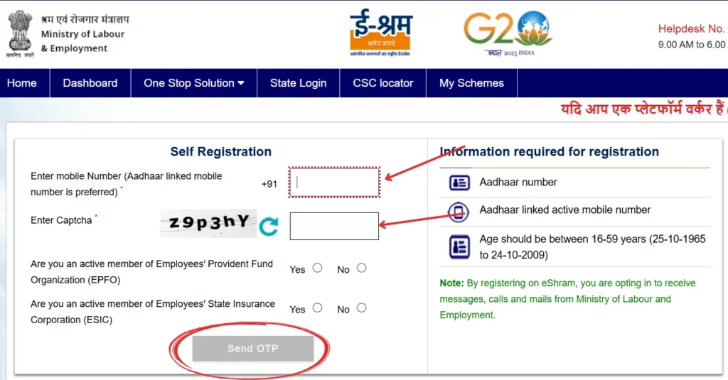 - अब अपना आधार से जुड़ा मोबाइल नंबर और कैप्चा दर्ज करे, इसके बाद आप EPFO या ESIC मेंबर है या नहीं इसका जवाब देकर “Send OTP” पर क्लिक करे, इसके बाद आपके मोबाइल नंबर पर OTP आएगा उसे डालकर Submit कर दें।