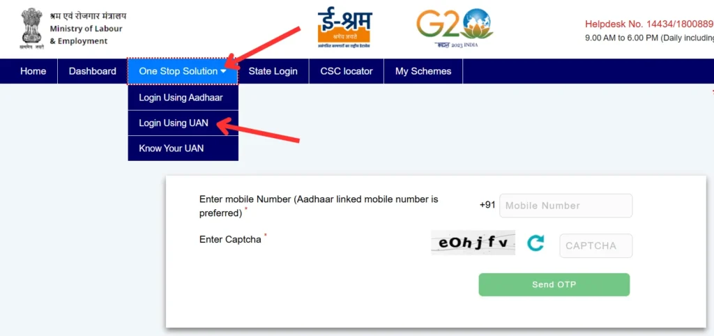 - इसके बाद One Stop Solution मेनू के अन्दर Login Using UAN पर क्लिक करे